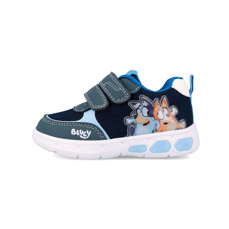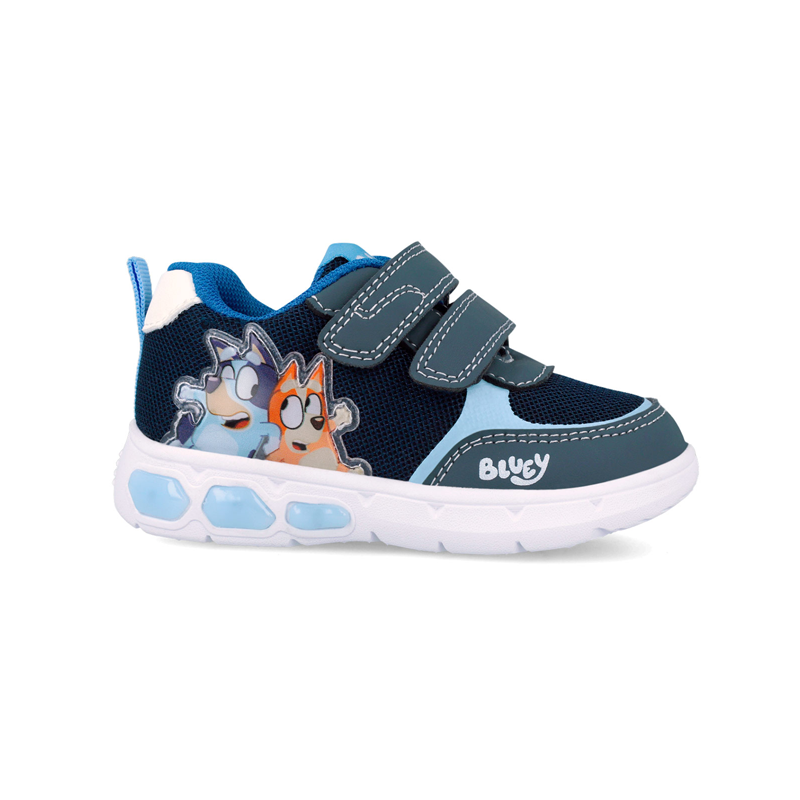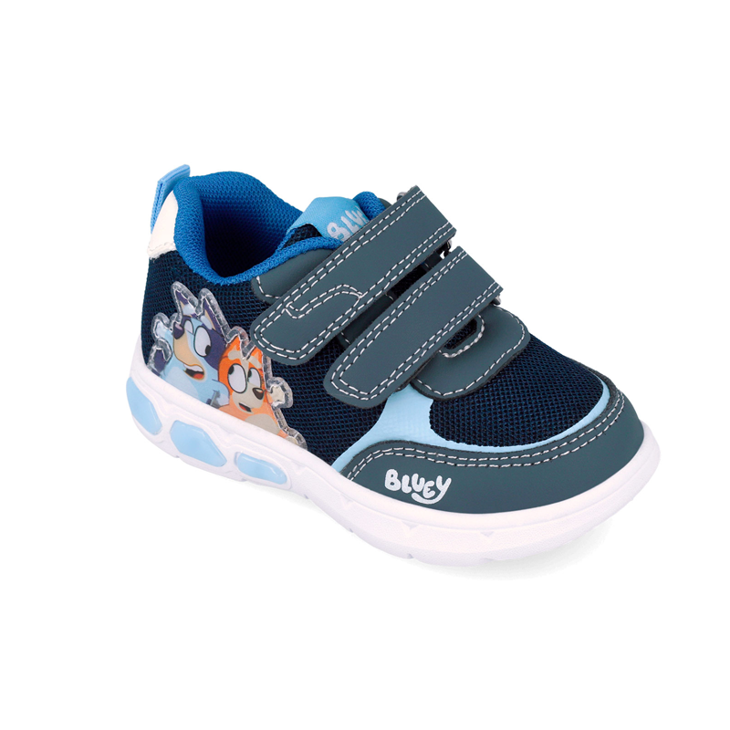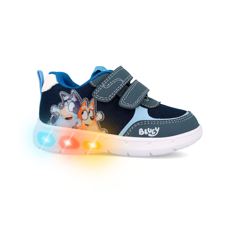 Παιδικά αθλητικά Bluey υφασμάτινα στο εσωτερικό με ανατομικό δερμάτινο πάτο και αντιολισθητική σόλα. Είναι παπούτσια ανατομικά και ελαφριά. Στο εξωτερικό είναι από ύφασμα και δερματίνη. Κλείνουν με δύο αυτοκόλλητα στο πάνω μέρος για ευκολία στη χρήση και στη σόλα ανάβουν φωτάκια κατά τη διάρκεια του περπατήματος.